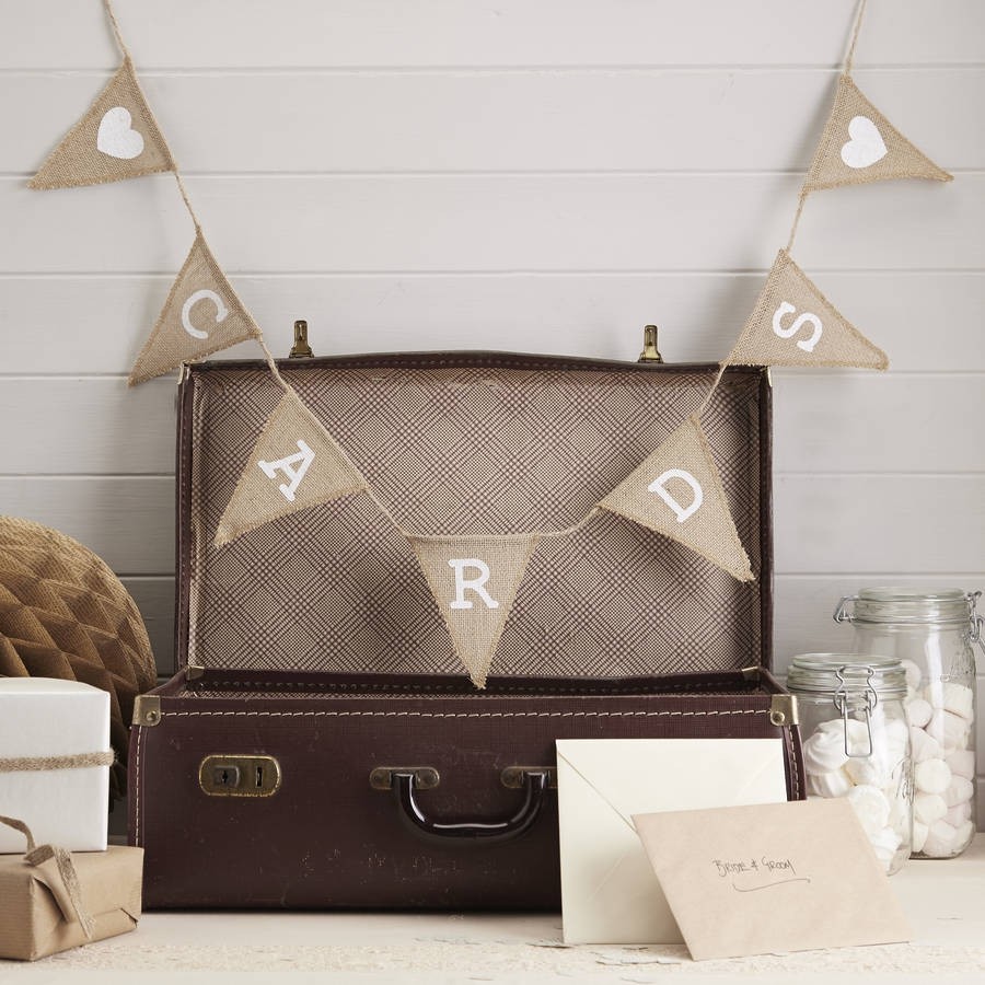 Banderínes rústicos hechos de tela de arpillera en los que pueden leerse la palabra  CARDS ( tarjetas ) . Disponed una zona especial  con una caja, saco, o maleta estilo antiguo y tarjetas al lado para que vuestros invitados dejes sus mensajes con los mejores deseos para vosotros, y hacedlo visible con estos banderines .