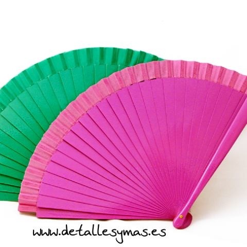 Abanico de madera lacada en colores variados y con una franja de tela en los extremos de 2 cms . Son de 23 cms de largo.