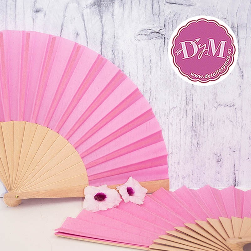 Abanico de madera con tela de color rosa . Mide 23 cms