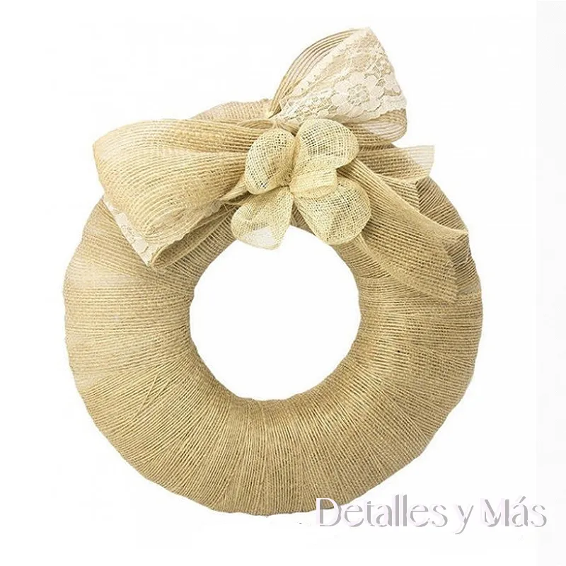 Está rematado por un lazo de yute y unas flores blancas de tela