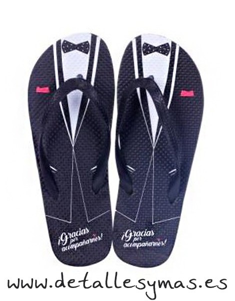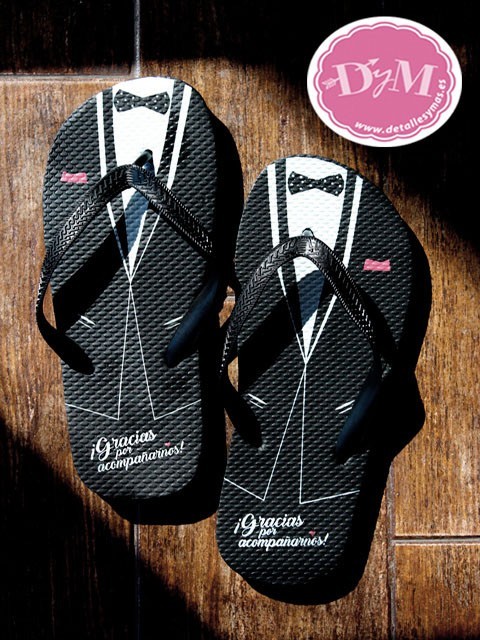 Divertidas chanclas impresas con el traje de un novio, ideales para bodas en la playa o verano .Vuestros invitados recuerdaran tu boda cada vez que las usen .