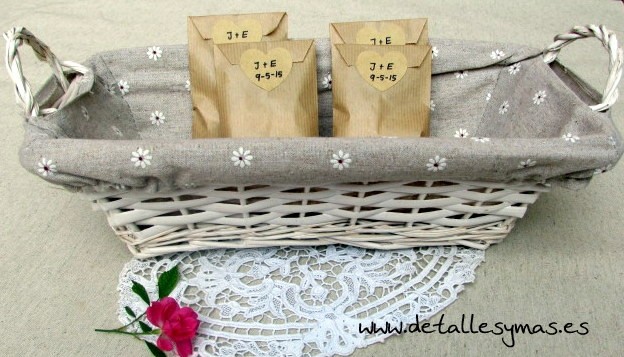 Bolsitas de papel rústico para arroz y adhesivo en forma de corazón con el que cerrarlas , en el que se puede escribir los nombres de los novios .