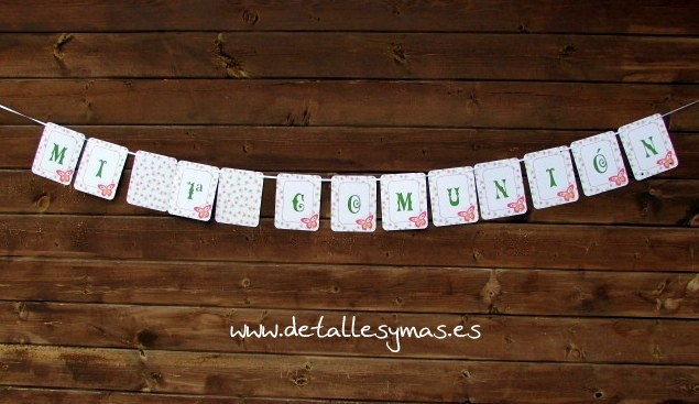 Banderín de flores y mariposas en donde se puede leer 1ª Comunión.