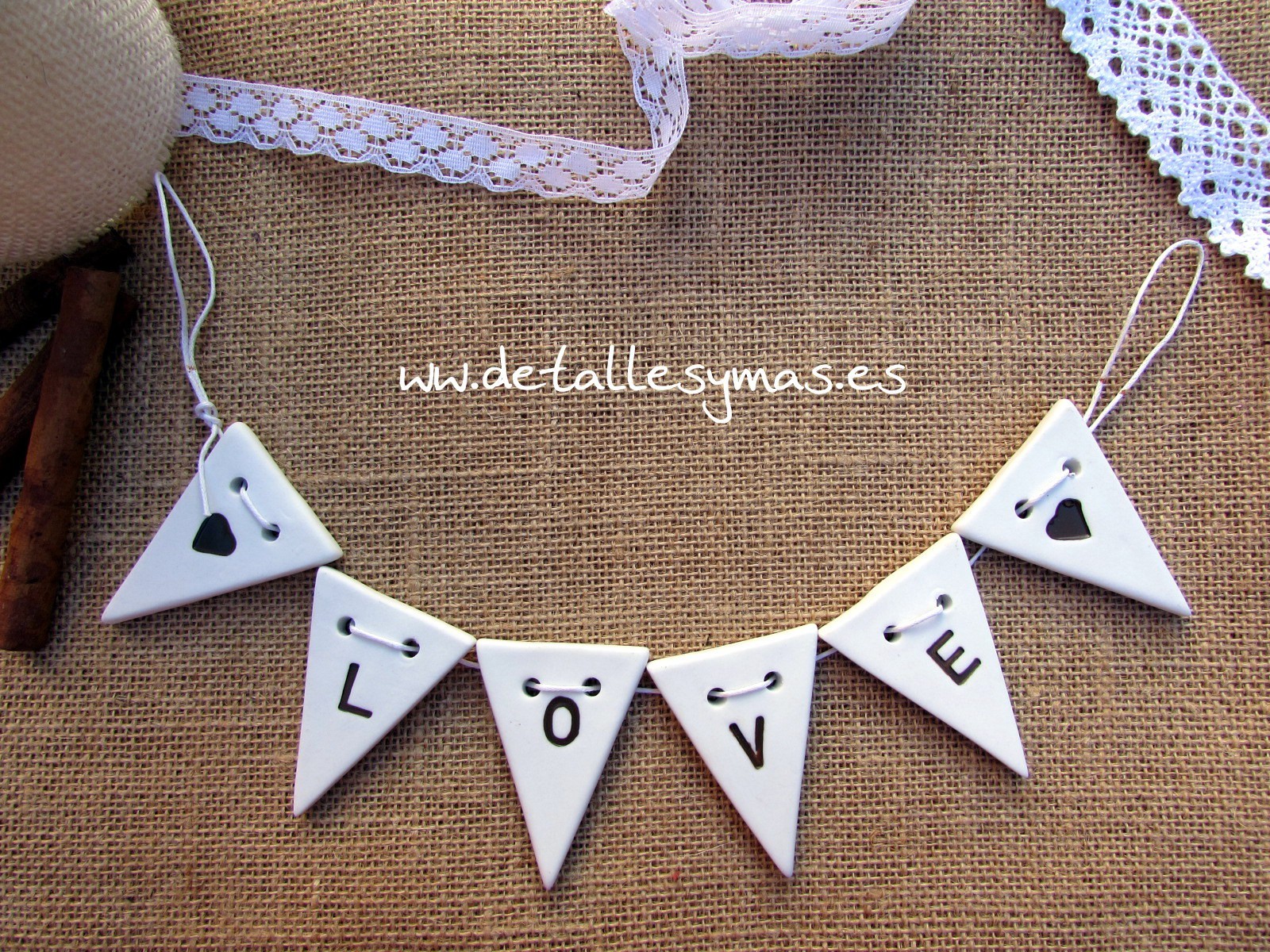 Pequeña guirnalda de banderines de cerámica en la que se lee la palabra LOVE.