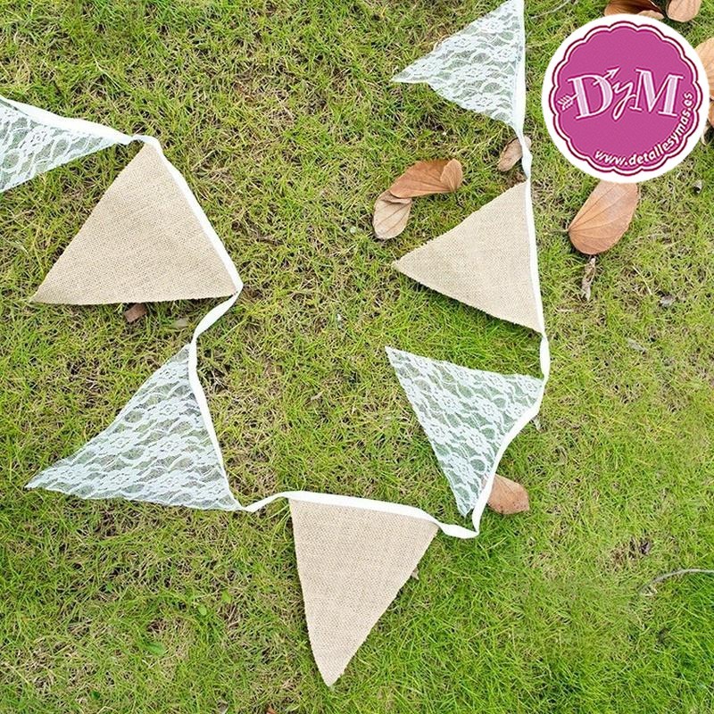 Banderínes hechos de arpillera y de encaje alternados . Unidos por una cinta de algodón , esto banderines son el toque romántico perfecto para una celebración al aire libre o rústica .
