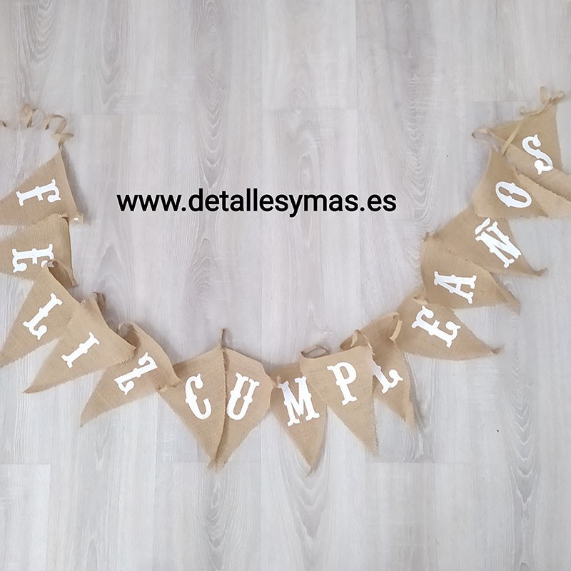 Banderines de yute o arpillera con la inscripción FELIZ CUMPLEAÑOS.