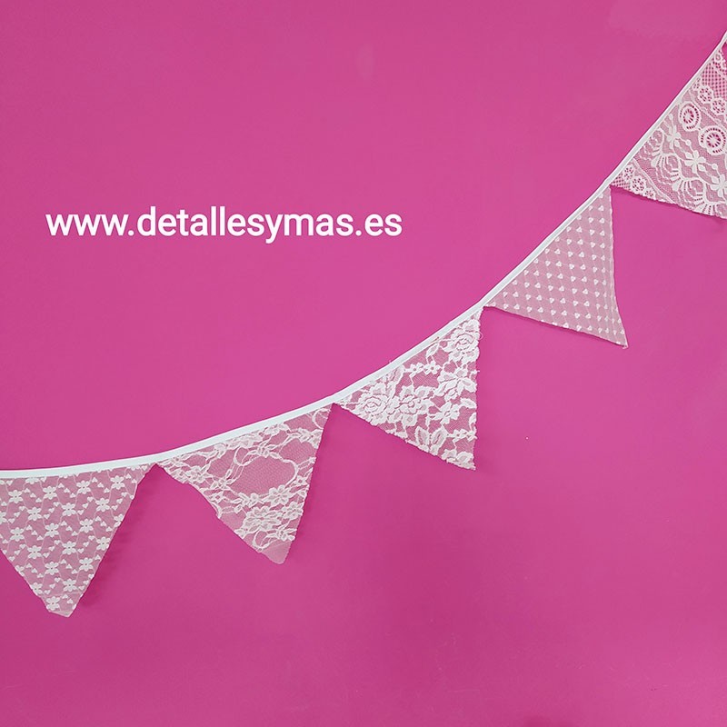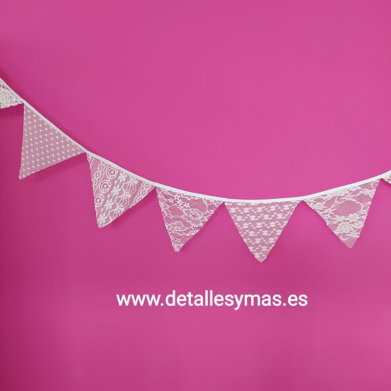 Preciosa guirnalda compuesta por 11 banderines de tela blanca de encaje.
