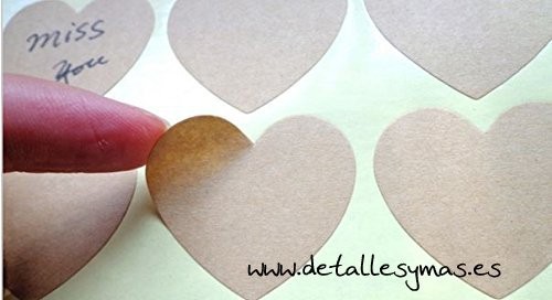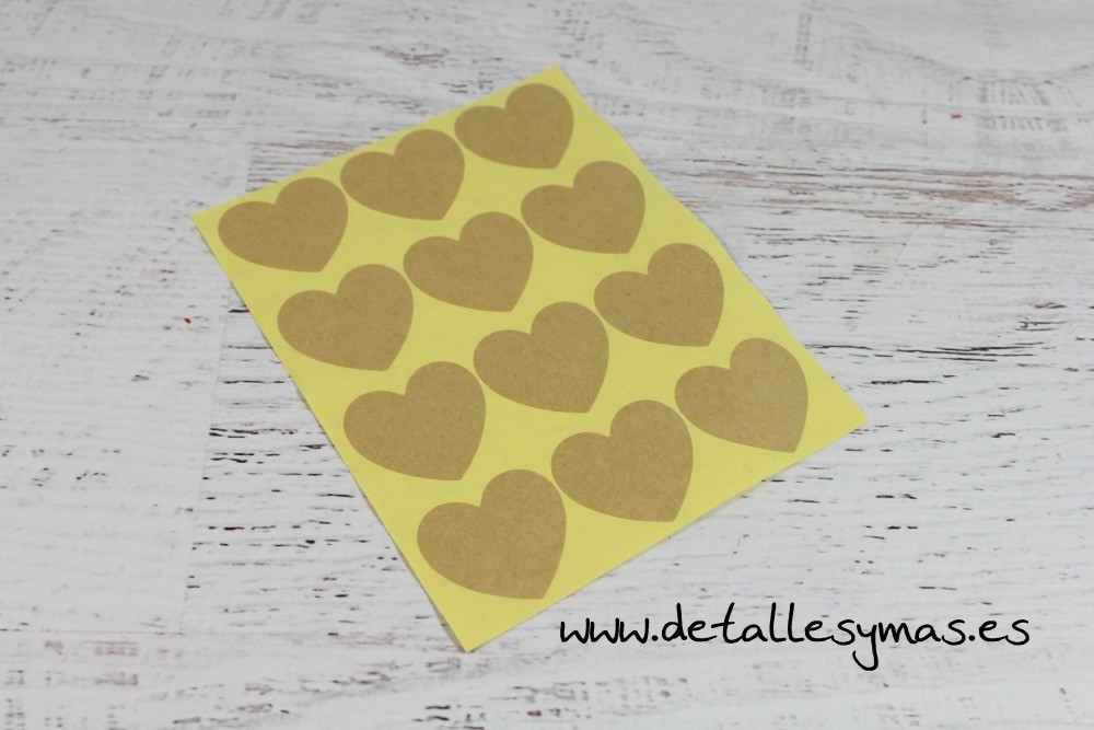 20 etiquetas adhesivas en papel kraft con forma de corazón . Miden 3 cms de alto x 3,5 cms de ancho