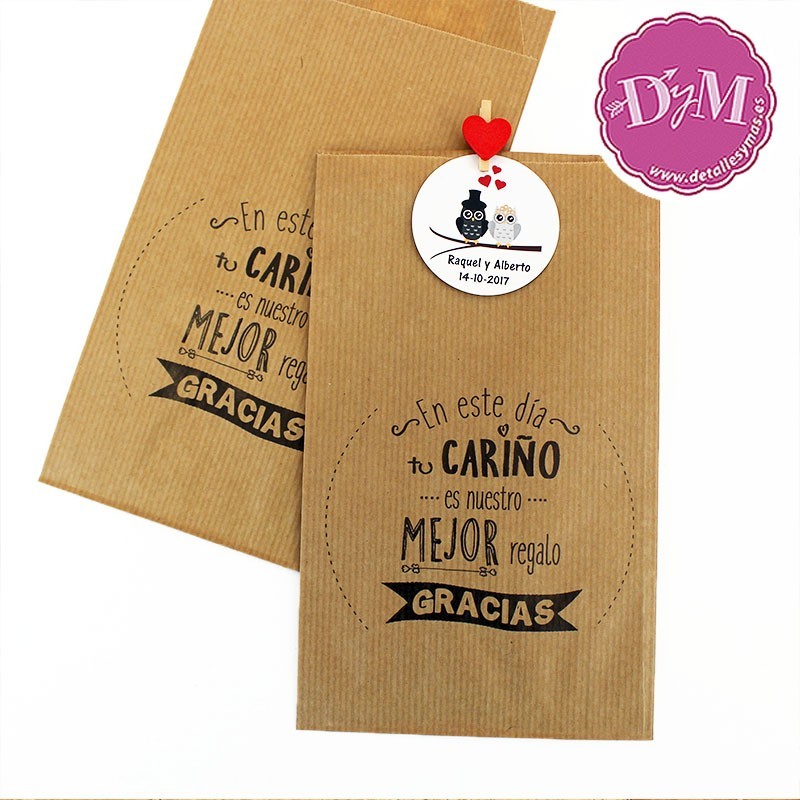 . Pack de 20 bolsas de papel Kraft en las que puede leerse la frase "En este día tu cariño es NUESTRO mejor regalo"