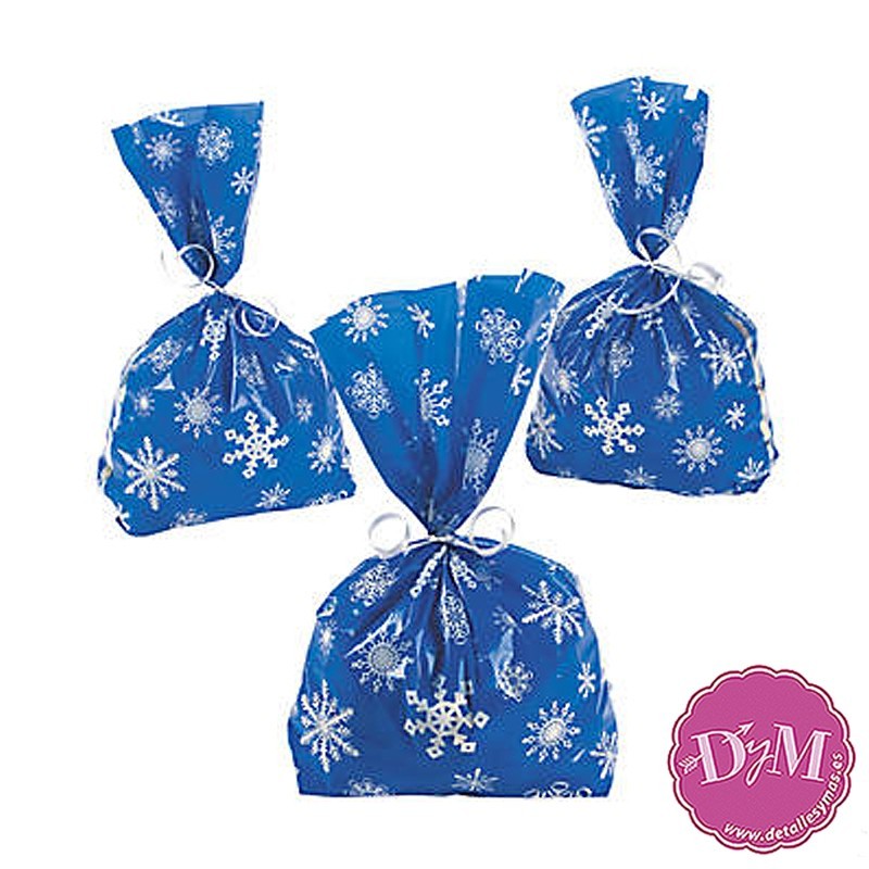 Bolsas de celofán en color azul y decorada con copos de nieve .Perfectas para fiestas de temática frozen , para llenar con chuches, presentar regalos, etc.