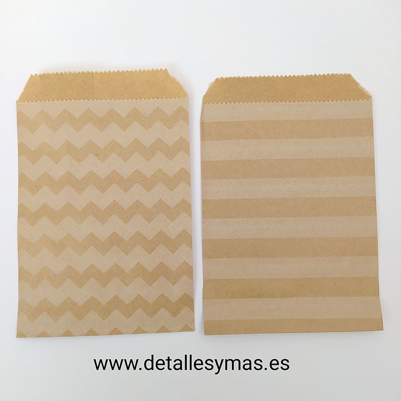 Bolsitas de papel kraft con rayas rectas y ondas, para presentar pequeños detalles o para el arroz . Para llenar de arroz y ofrecerlas a los invitados en pequeñas cestas .
