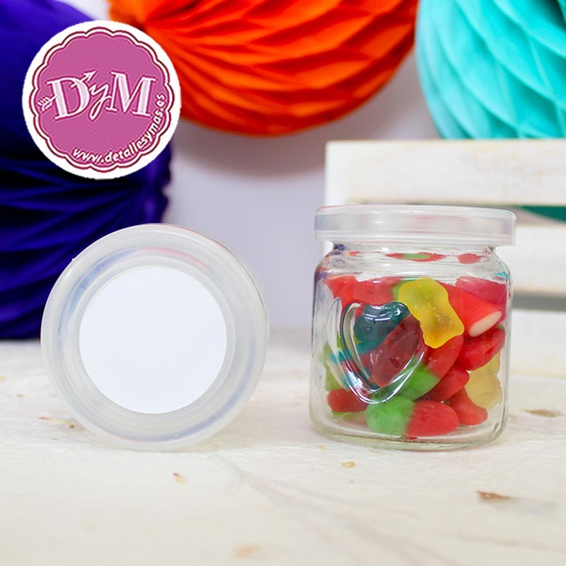 Tarros de cristal redondos en los que hay un corazón grabado en ambos lados. La tapa es de plástico y es perfecta para poner uno de nuestros adhesivos.