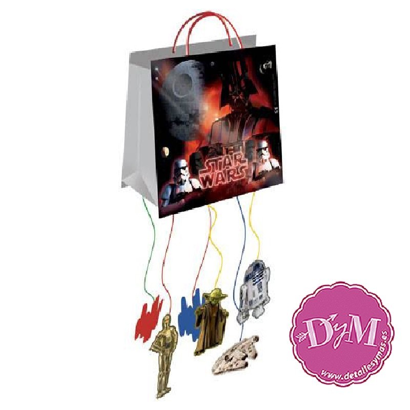 Piñata con los famosos personajes de La Guerra de las Galaxias .Rellénala con sus chuches preferidas para que tiren de las cintas y caigan.