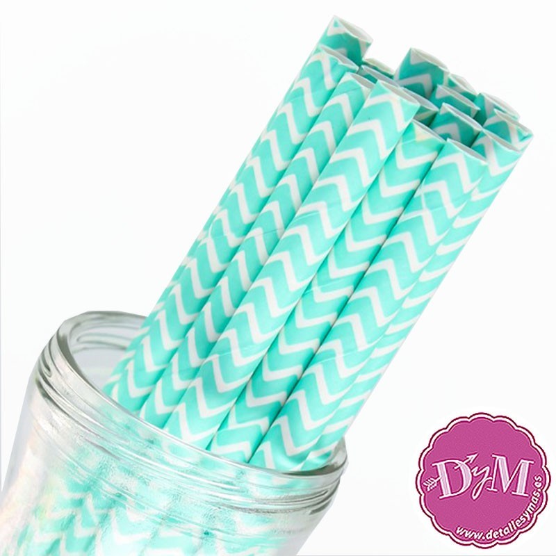 Pajitas de papel decoradas con rayas chevron en color azul aqua, Decora con ellas el candy bar de cumpleaños o todo tipo de fiestas infantiles .