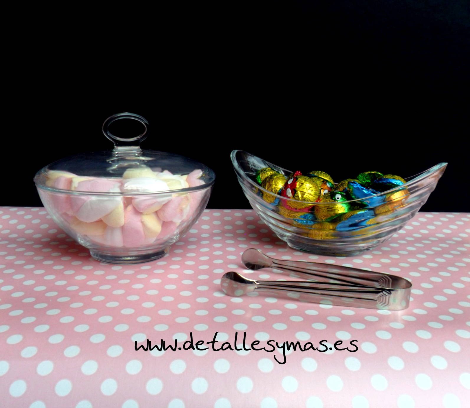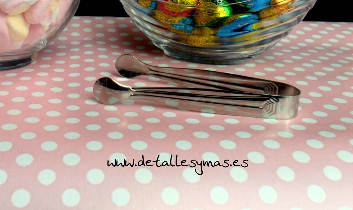 Unas pequeñas pinzas para servir las chuches de las bomboneras . Hechas de acero inoxidable y finamente labradas .