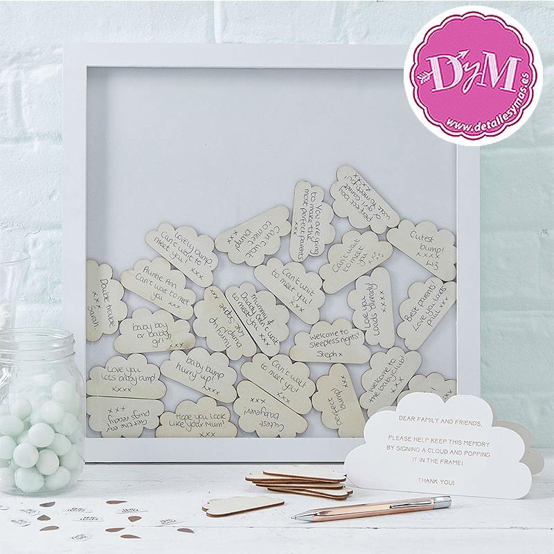 Ideal para que los invitados dejen sus mensajes. Este Marco es como una hucha, en la que se introducen pequeñas nubes de madera en la que los invitados han escrito sus felicitaciones. Luego los introducen en el marco y pueden así conservarse y revisarlos cuando se quiera. .