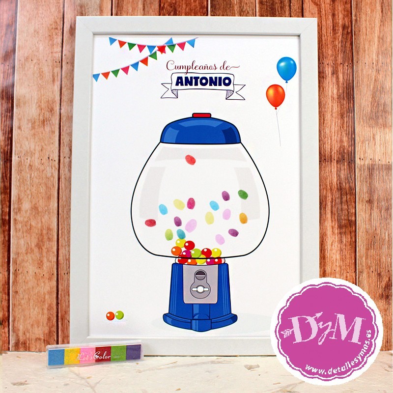 Lámina de huellas para cumpleaños o comunión. Personalizado con el nombre, tipo de evento y la fecha. Llena la máquina de chicles con tus huellas .