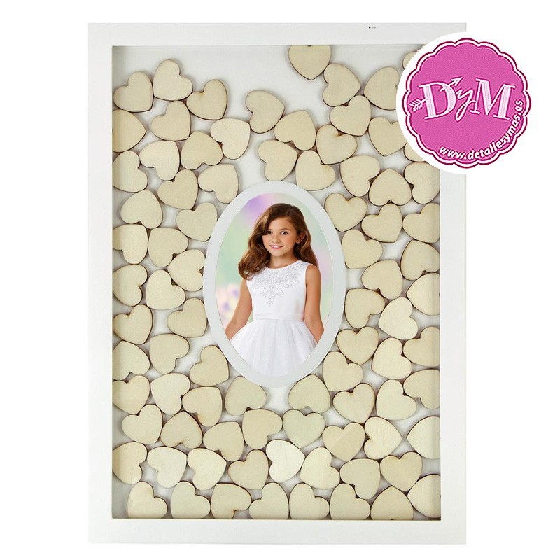 Marco para introducir pequeños corazones de madera en los que los invitados pueden dejar su dedicatoria. Se puede personalizar con la foto del niño o niña y cambiarla facilmente (foto no incluida)