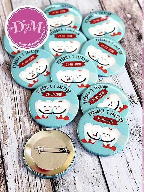 . Chapas personalizadas para bodas, con unas simpáticas muelas novios ,que se personalizan con los nombre y fecha del enlace .