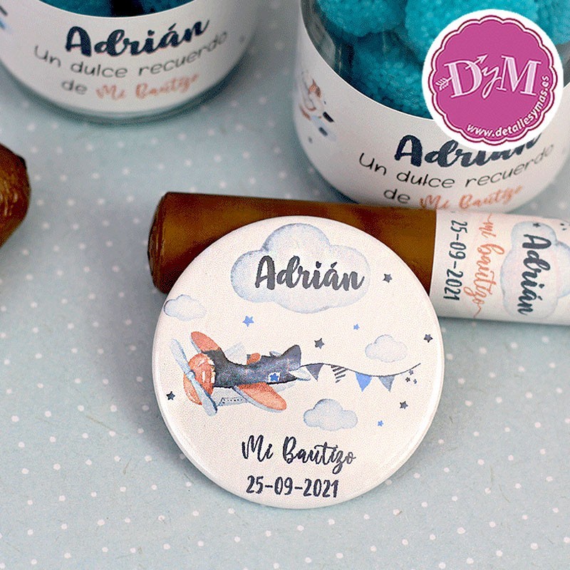 .Originales chapas para bautizo o baby shower de niño de la Línea Avioneta, con fondo grisáceo y una graciosa avioneta en colores azules.