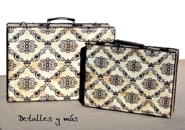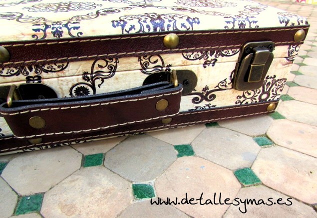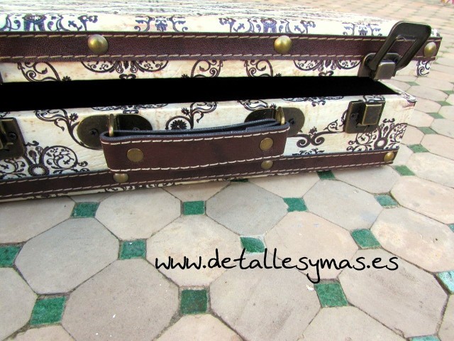 Maleta de estilo antiguo forrada de simil piel con un precioso diseño barroco en colores tierra. Con herrajes y remaches en metal avejentado