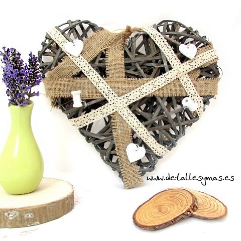 Corazónes de gran tamaño ( 30 x 30 cms) hecho de ramas de color tostado y decorado con tiras de arpillera, encaje y pequeños corazones y carretes . Para decorar cualquier rincón .Llevan un aro en la parte superior para poder colgarlos .