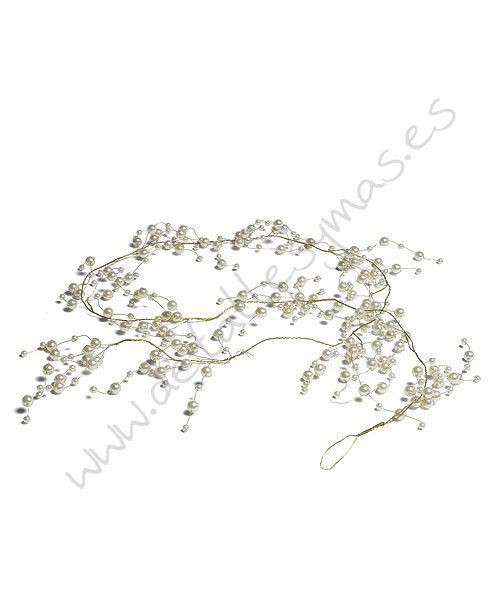 Este versátil adorno de alambre dorado y perlas, a juego con otros artículos para decorar las mesas como los árboles y la numeración de las mesas, darán un toque de distinción a la mesa principal, mesa de la tarta, de regalos o de otro lugar que requiera una especial distinción en el banquete.