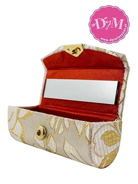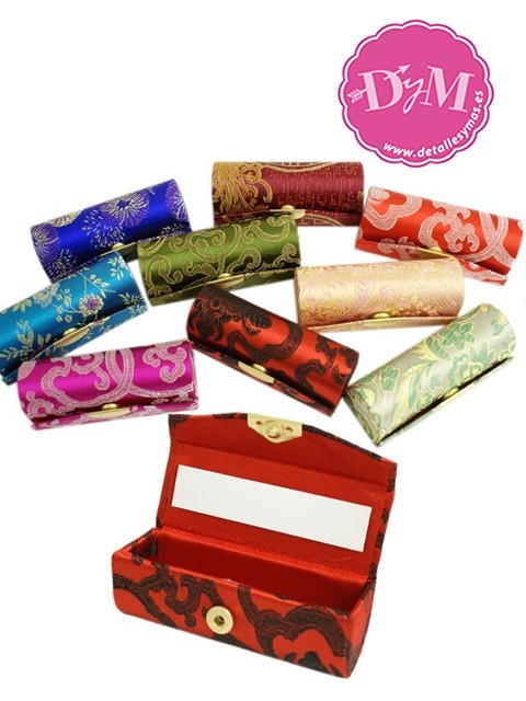 Práctica funda para llevar el pintalabios, con espejo en su interior. Forrado en llamativas tela de quimono, se sirve siempre en colores variados.