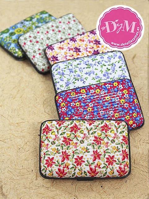Un práctico tarjetero rígido decorado con alegres diseños de flores .