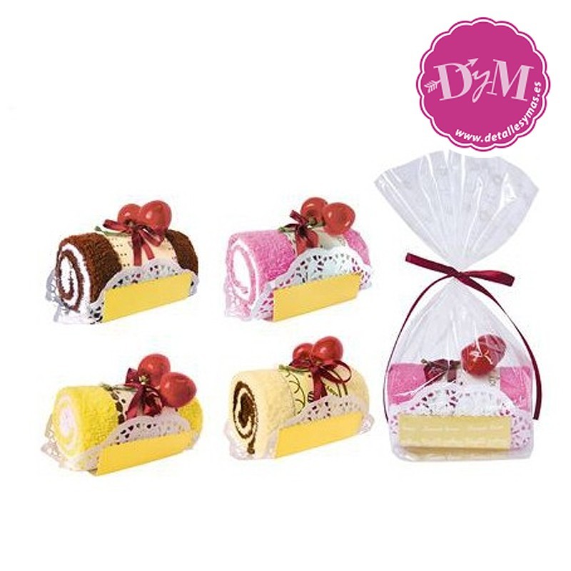 . Delicioso brazo de gitano hecho de 2 toallas en dos colores contrastados. Se presenta en bolsa de propileno.