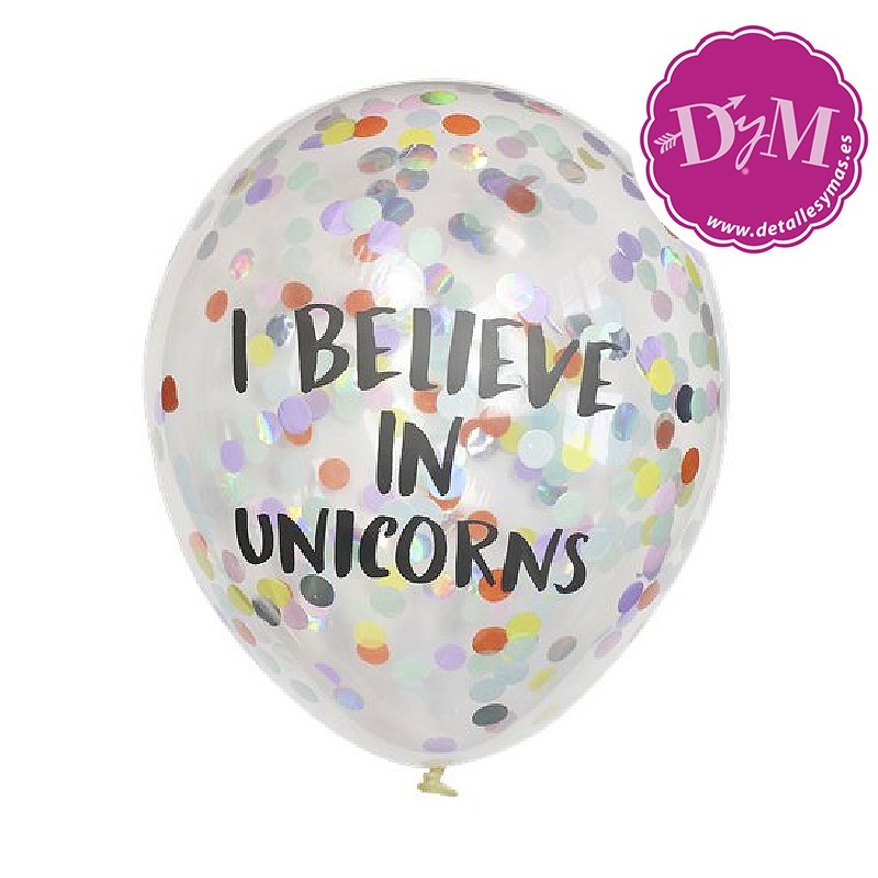Globos de latex transparentes llenos de confetti de colores de gran diámetro y con el mensaje "I believe in unicorns" ( creo en los unicornios )