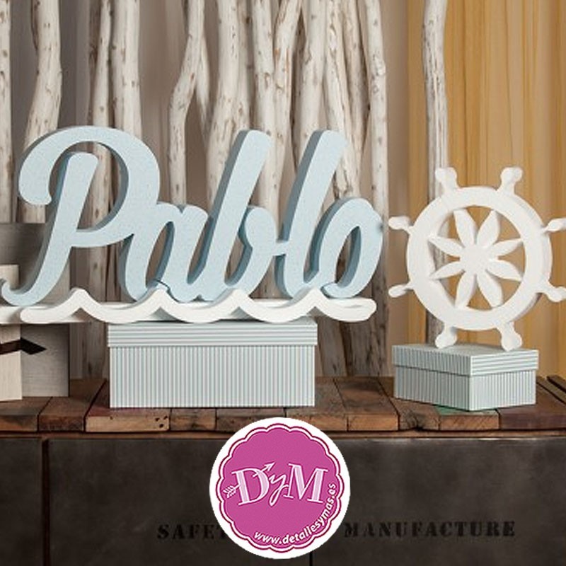 El nombre de tu hij@ en Corcho en color azul ,para poner encima de la mesa del convite, en el Candy bar y al terminar en su habitación. Acompañado de un timón o ancla.ideal comuniones -marinero.