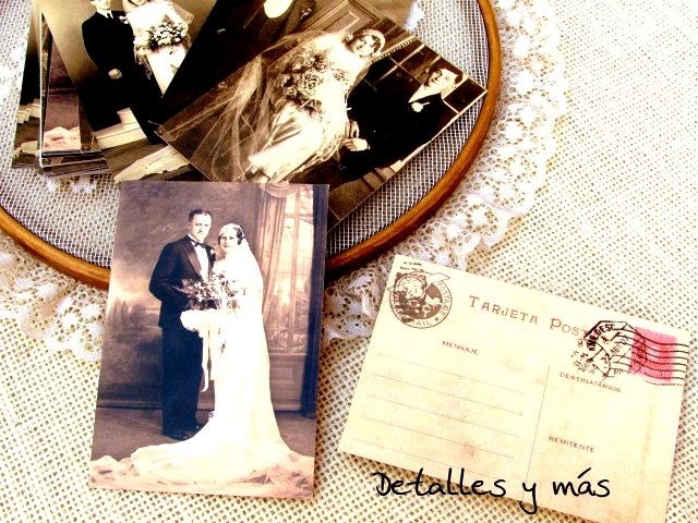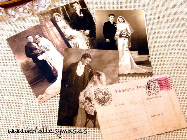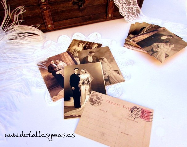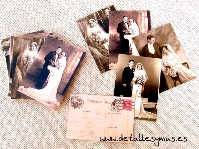 Con fotografias de autenticas bodas antiguas y diseño de postal antigua en el reverso donde los destinatarios serés vosotros y el remitente el invitado que deje el mensaje.