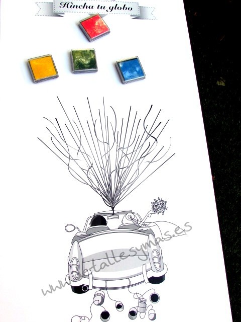 En este árbol de huellas los novios se van en el coche de luna de miel pero los invitados han de ayudar a formar los globos que los llevarán lejos con sus huellas .