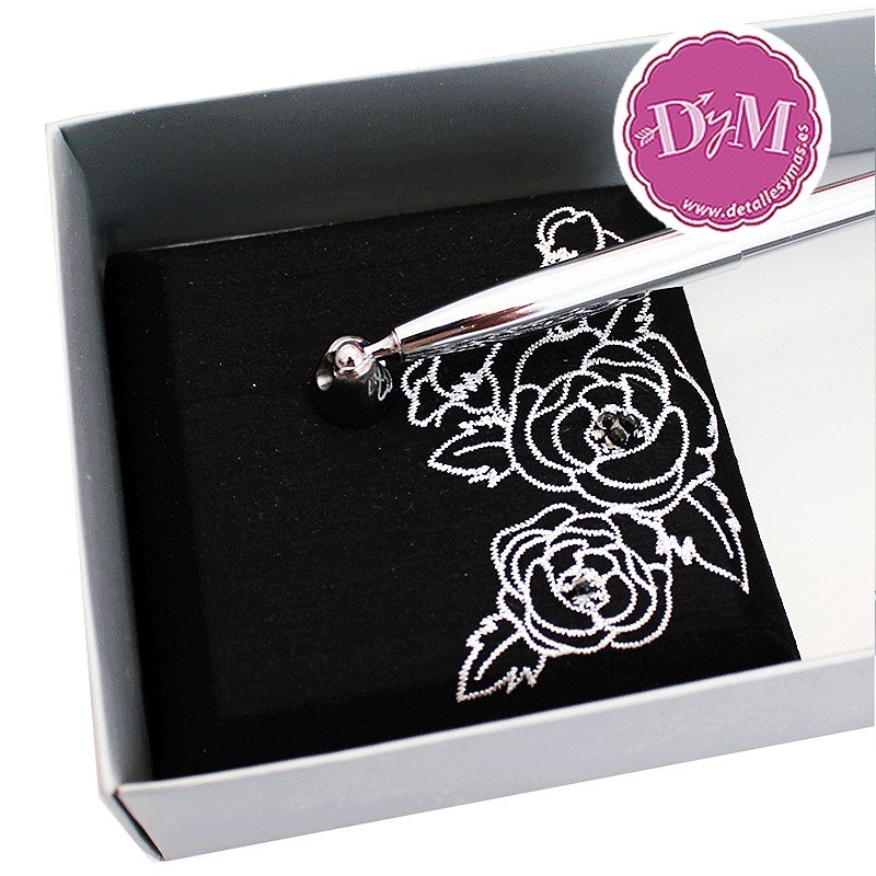 Bolígrafos metálicos para firmar en los libros de firmas o árboles de huellas , con una base forrada de sera y bordada.