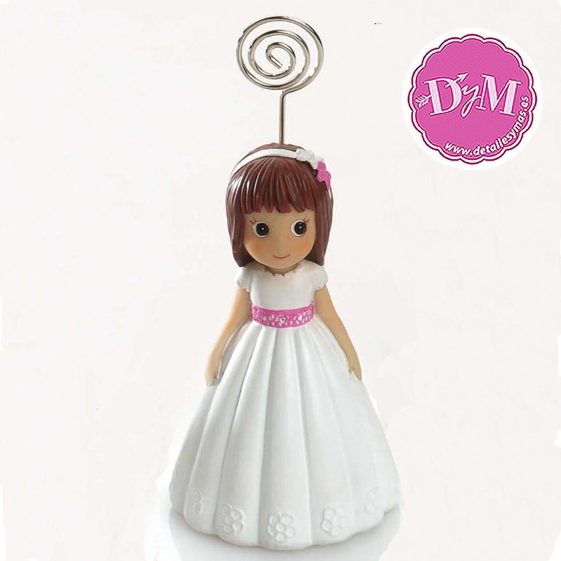 . Figura de resina de niña vestida de comunión con un fajín de color rosa fucsia y diadema a juego.