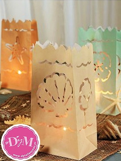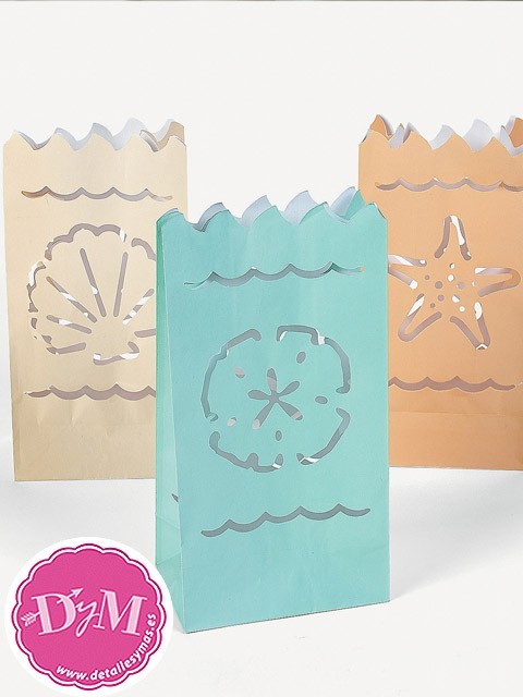 Bolsas de luz de colores suaves con conchas marinas perforadas .Ideal para iluminar bodas de playa o fiestas nocturnas . Bolsa de 12 unidades con 3 modelos surtidos. Para usar con velas de té o velas led .