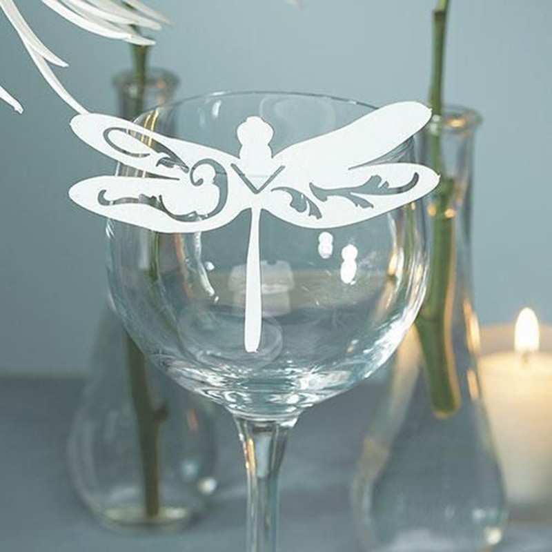 Una delicada libélula que se posa sobre las copas conforma este elegante marcasítios en el que podrás escribir el nombre de los comensales.