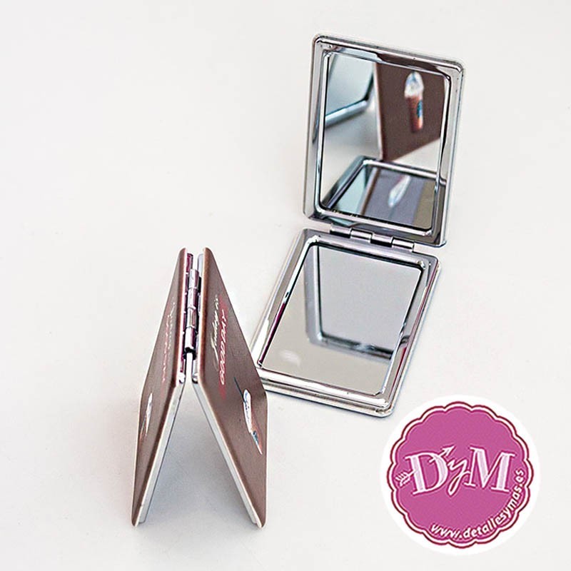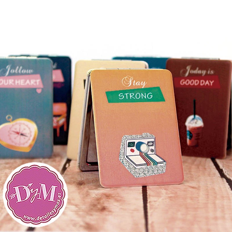 Divertidos espejos para boda con frases de buenos deseos . Recubiertos de polipiel por ambas caras y cierre imantado .
