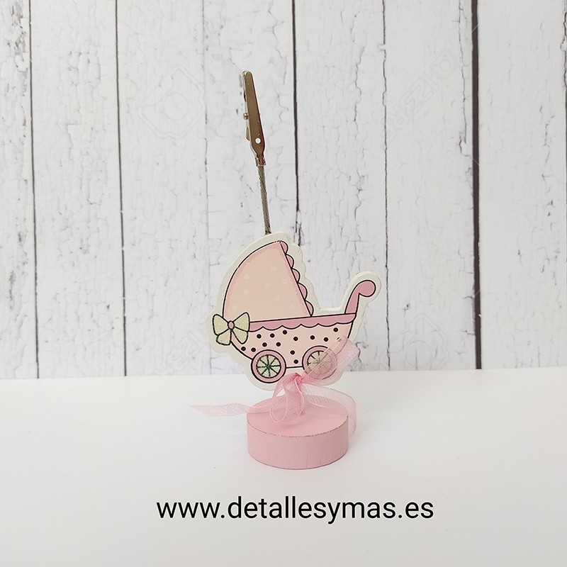 Pinzas de madera para fotos o notas con un bebe en un carrito de color rosa. Para reglar fotos o poner notas en el bautizo, 1er añito o Baby shower, etc.