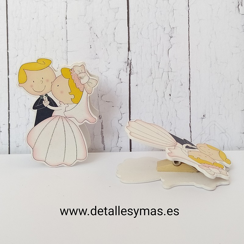 Pinzas de madera grandes con una pareja de novios Es un complemento ideal para la presentación de detalles y regalos.