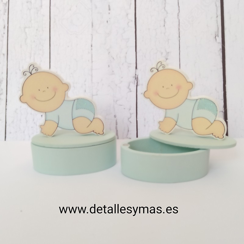 Cajitas azul  con tapa imantada . Son pequeños joyeros de madera  con la tapa coronada por un gracioso bebé gateando.
