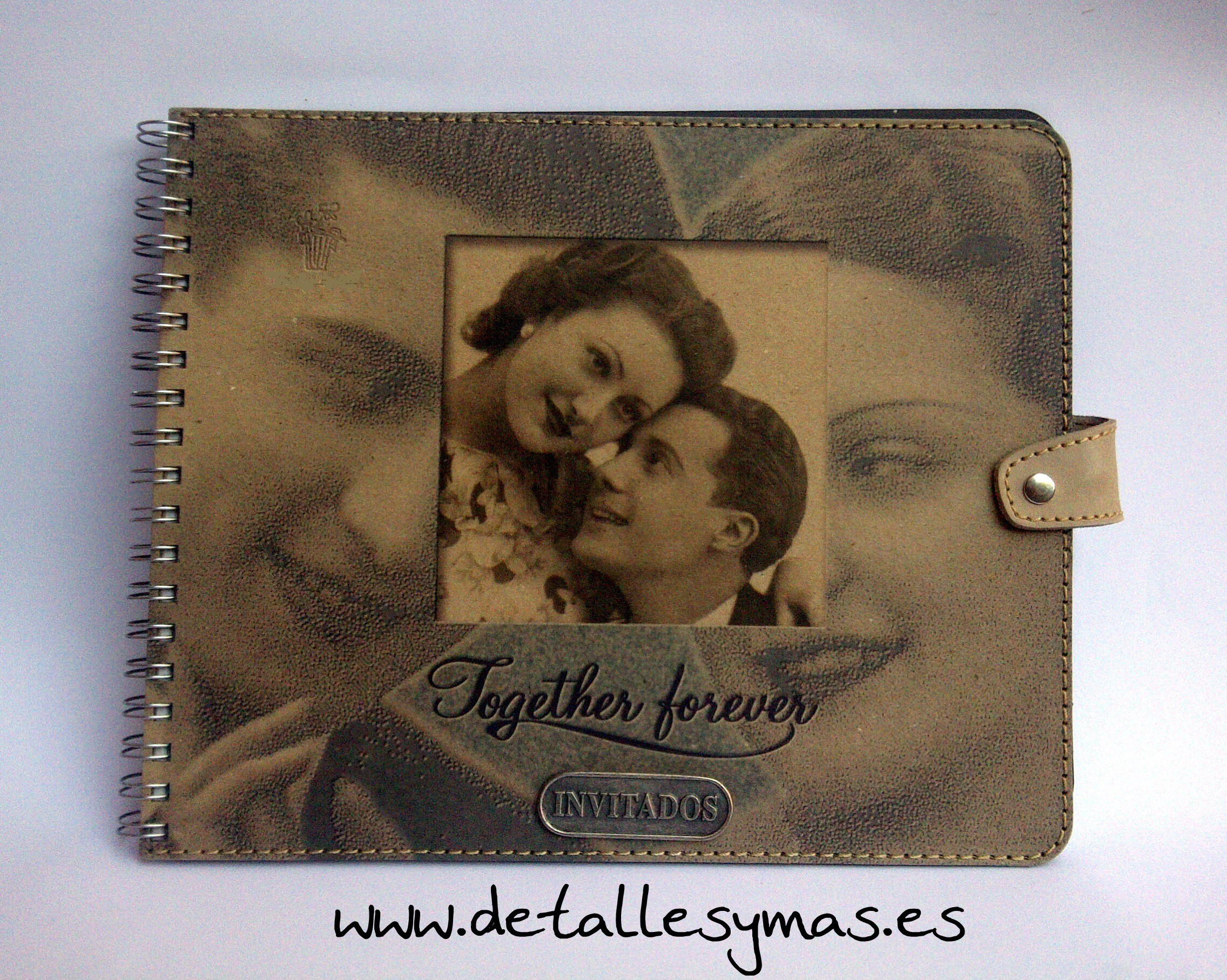 Otro modelo de libro de firmas con aire retro ya que en la portada aparece una fotografia antigua de unos enamorados.