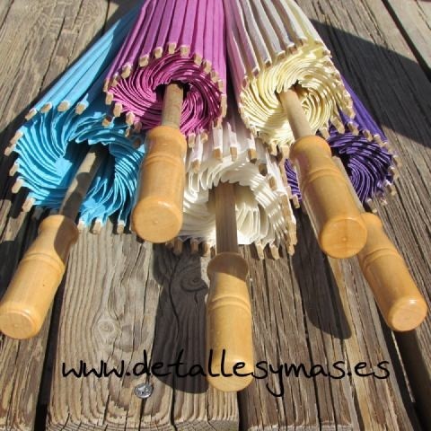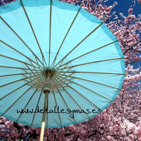 Parasol de papel en color azul turquesa . La estructura es en madera sin teñir y el entramado en hilo blanco . Hechas en un precioso color turuqesa .