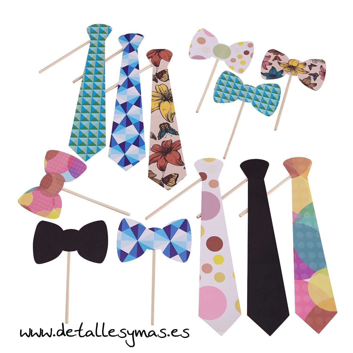 Pack para photocall con 12 accesorios 6 corbatas y 6 pajaritas de cartón grueso en colores muy alegres .Vienen ya con un stick de madera adherido para poder sujetarlos.
