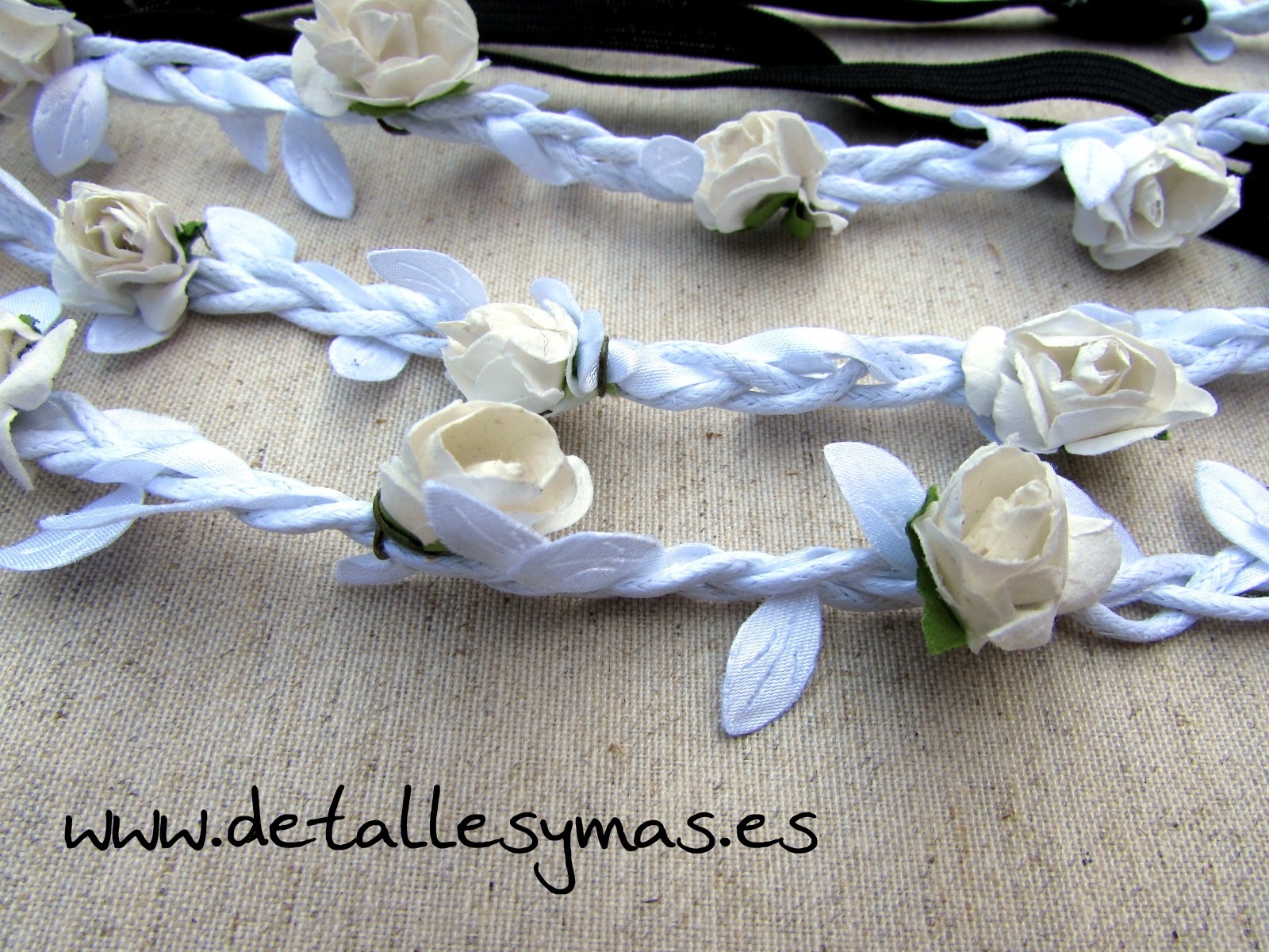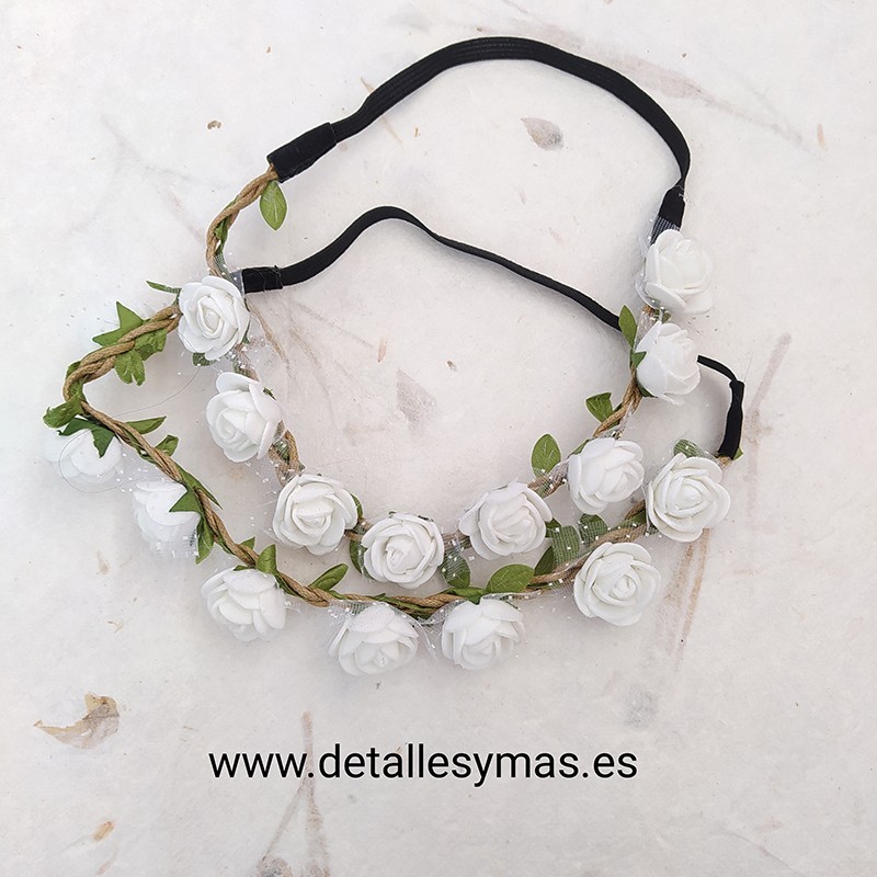 Diademas elásticas en color blanco , adoradas con pequeñas rosas de papel , para usar tanto en el pelo como en la frente .