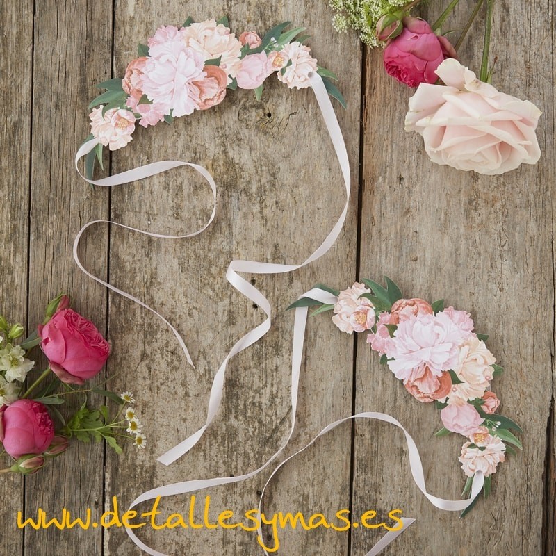 Tiaras de flores estilo Boho hechas de cartón con diseño de románticas flores pintadas a mano impreso.Vienen en paquets de 8 unidades y miden 23 cms . Cada tiara lleva una cinta de raso rosa parapoder atrlas .