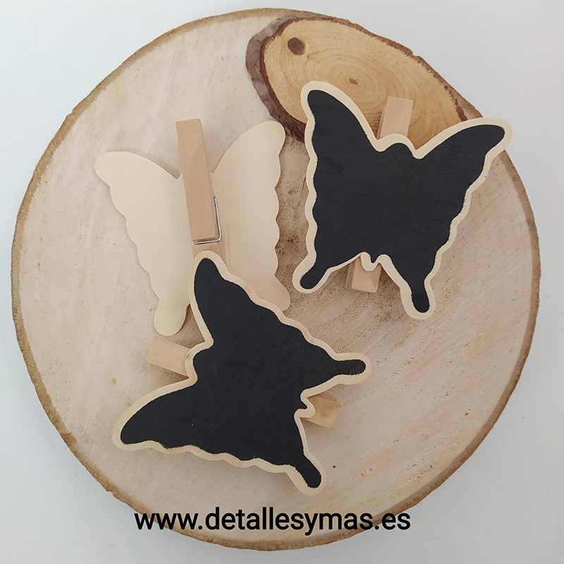 Pizarras pequeñas de madera con forma de mariposa que llevan en la parte trasera una pinza para que se puedan poner en cualquier regalo.