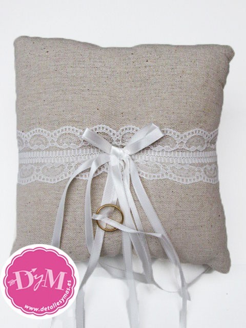Cojín hecho de lino rústico, con una gruesa cinta de encaje y cintas de raso par a atar los anillos.