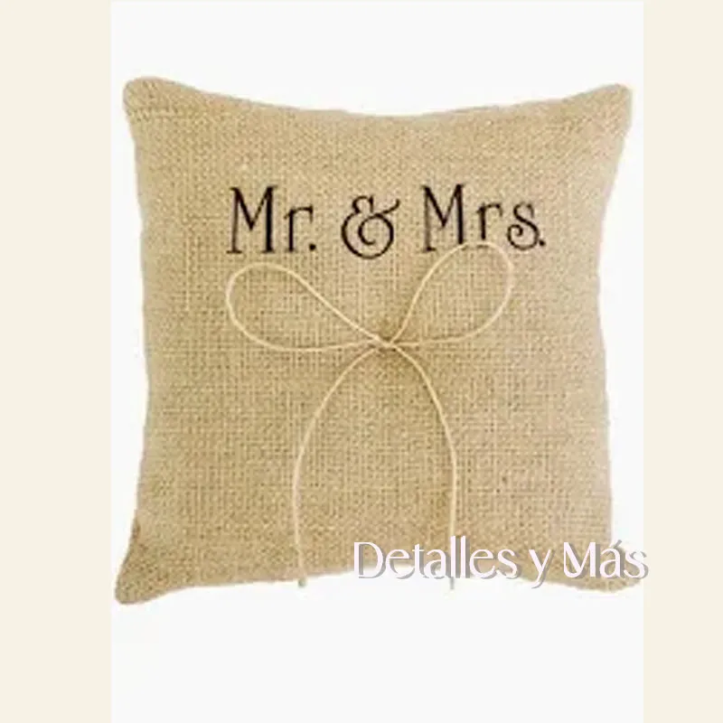 Cojín de anillos de boda en estilo rústico ,hecho de arpillera. Está impreso Mr & Mrs